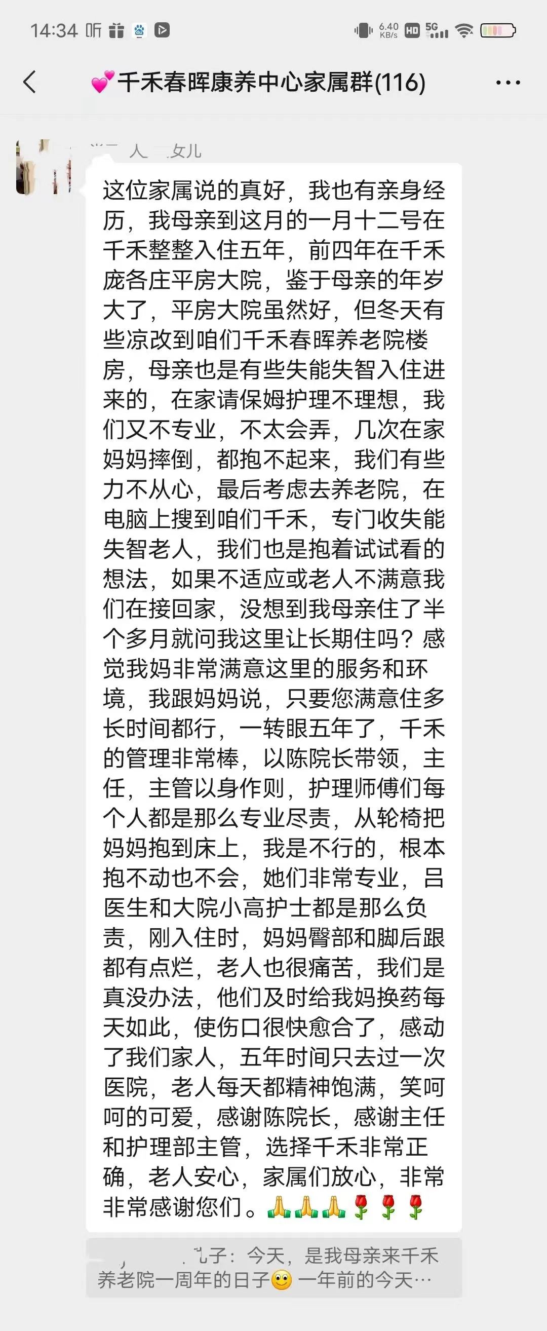了解到阿姨以前爱跳舞唱歌,我们有意识给阿姨放些文艺节目,类似唱歌跳舞的,阿姨听着听着,也会跟着哼唱起来。每次家属来,都说看到老人和我们更亲。听到家属这么说,我很自豪。
